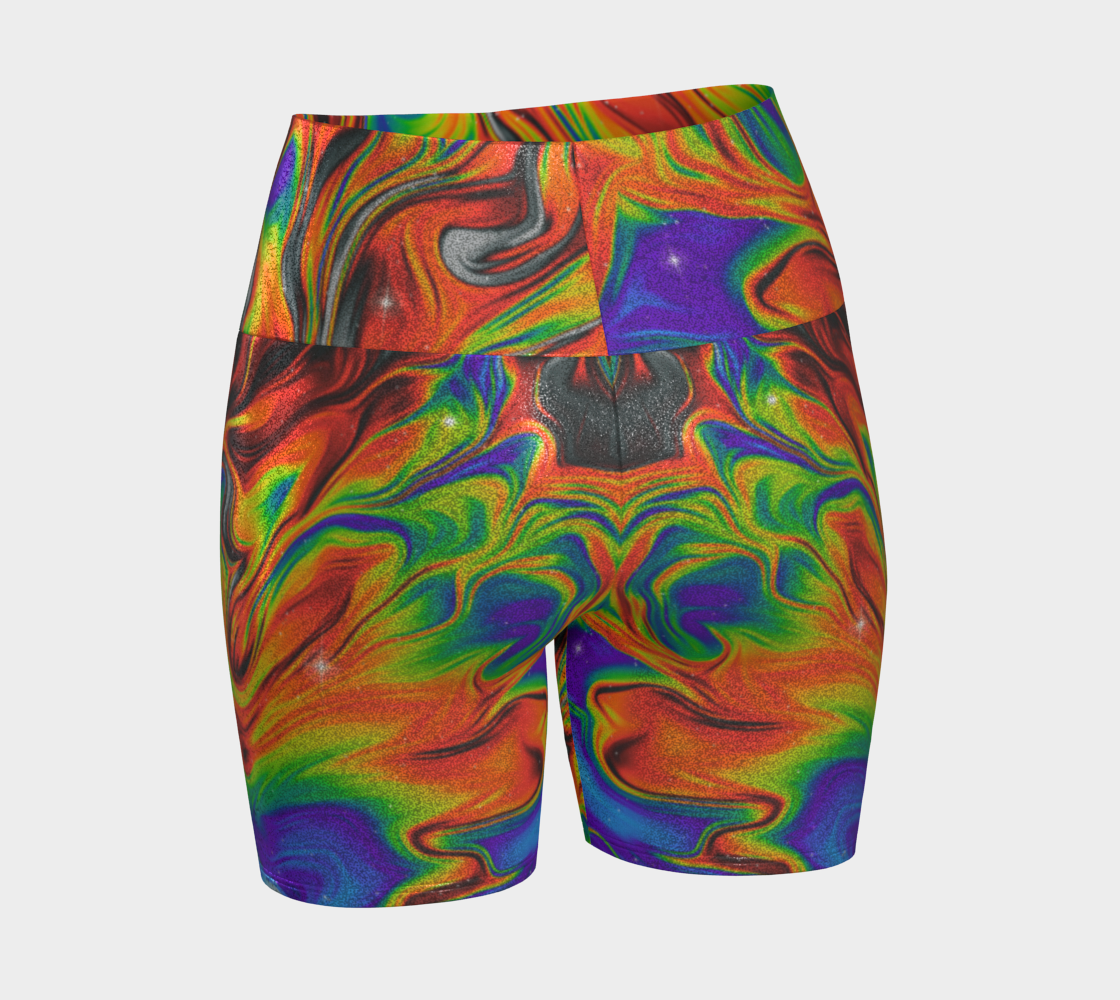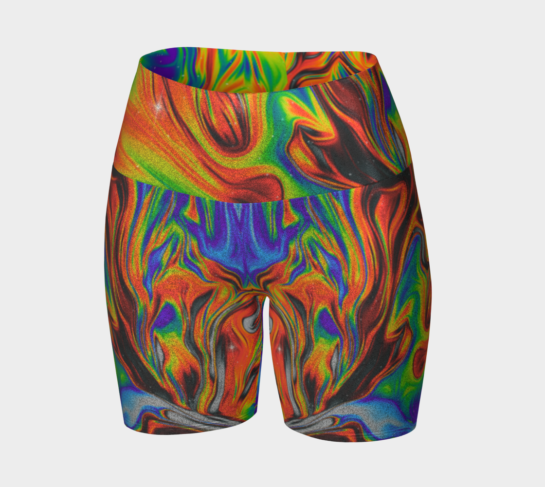 Print-on-demand yoga shorts, made from ecopolyester fabric in Canada. Featuring a high waistband and 6" inseam, these shorts offer optimal support and coverage during every pose.