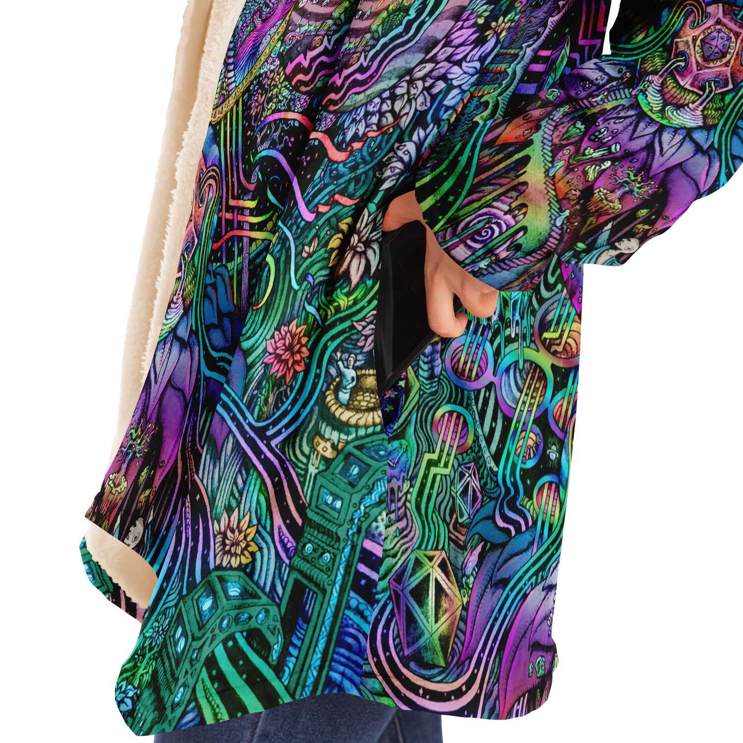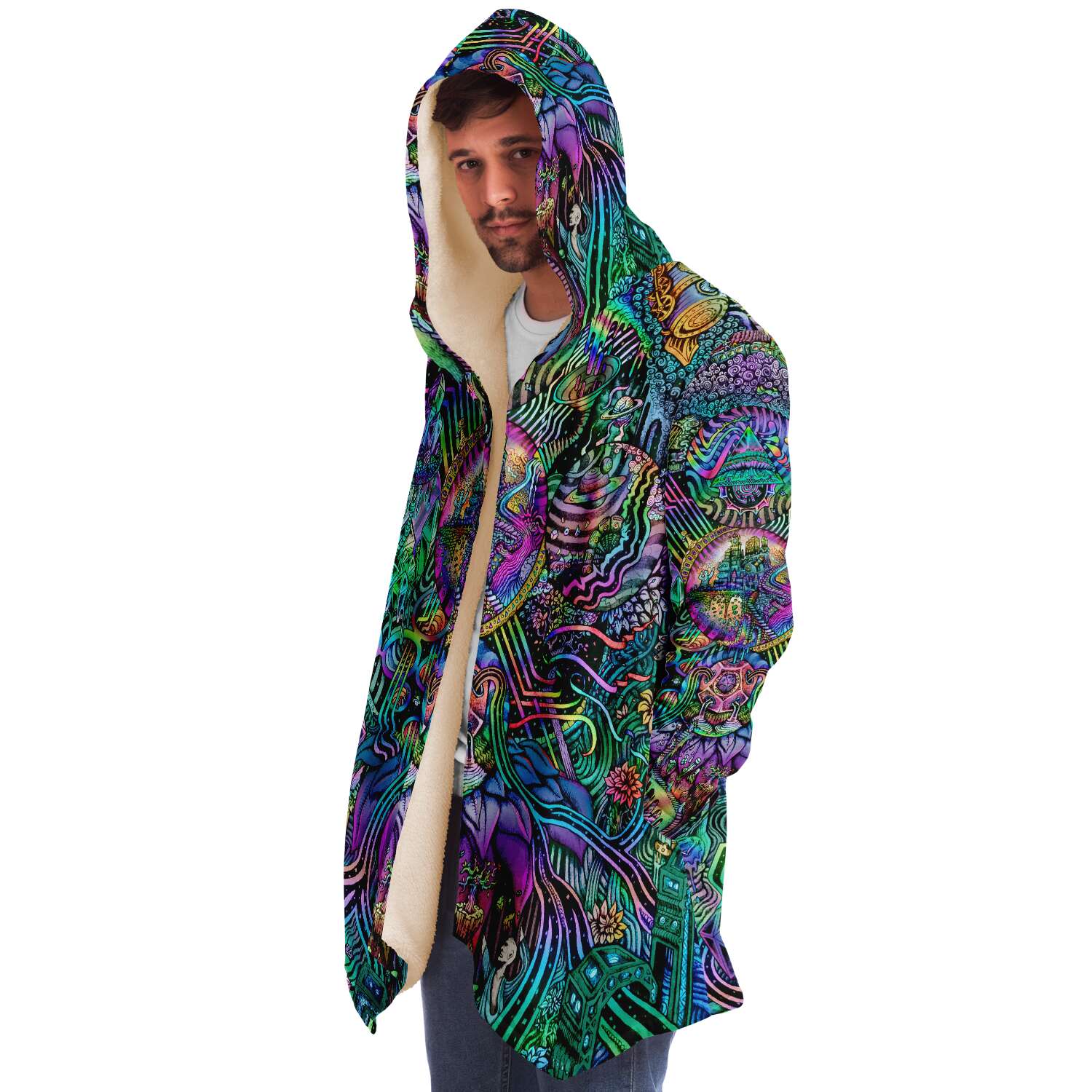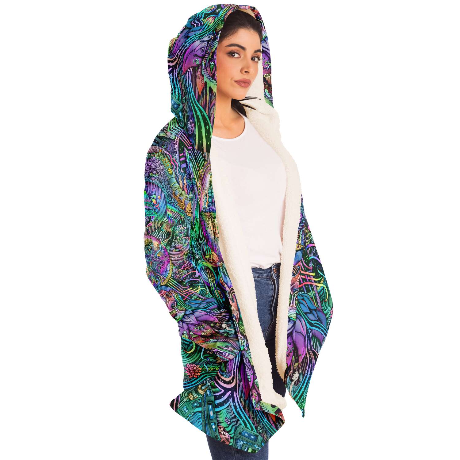 This luxurious cloak is made from an ultra-soft premium microfiber fleece lining. The outside is made with a micro-mink polyester fabric that allows the print to be high definition with vibrant colors. Featuring two deep side pockets to keep your belongings safe and your hands warm.