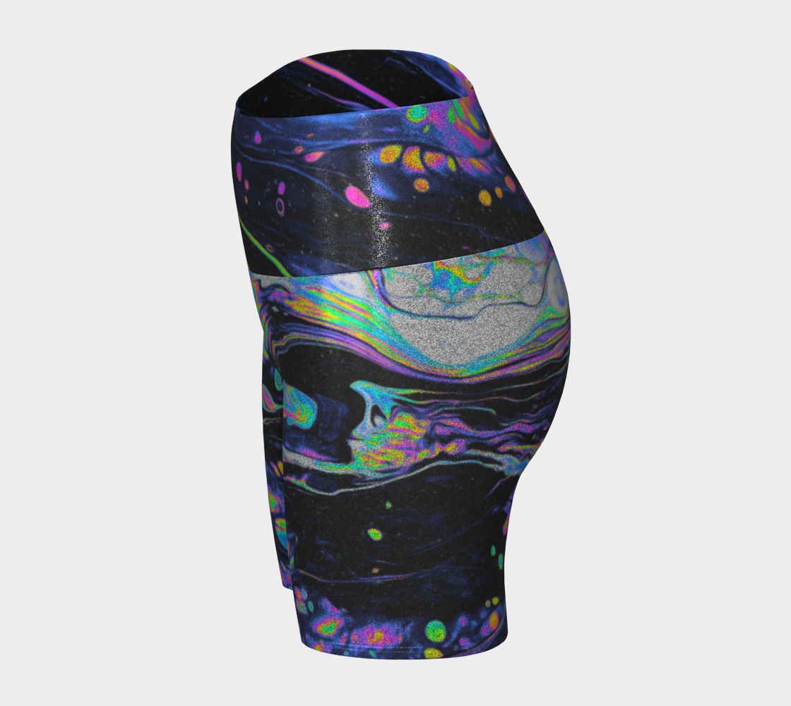 Print-on-demand yoga shorts, made from ecopolyester fabric in Canada. Featuring a high waistband and 6" inseam, these shorts offer optimal support and coverage during every pose.