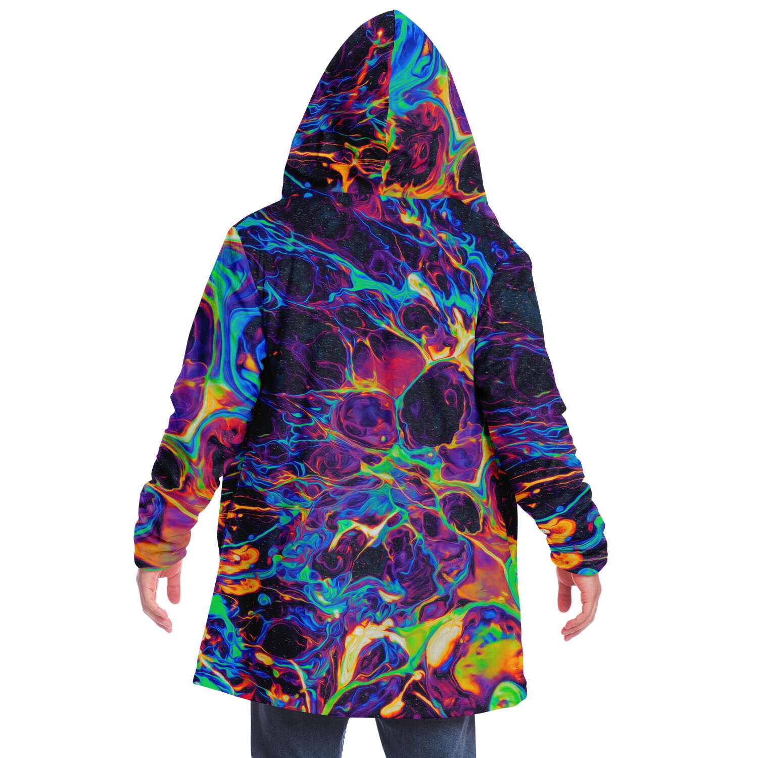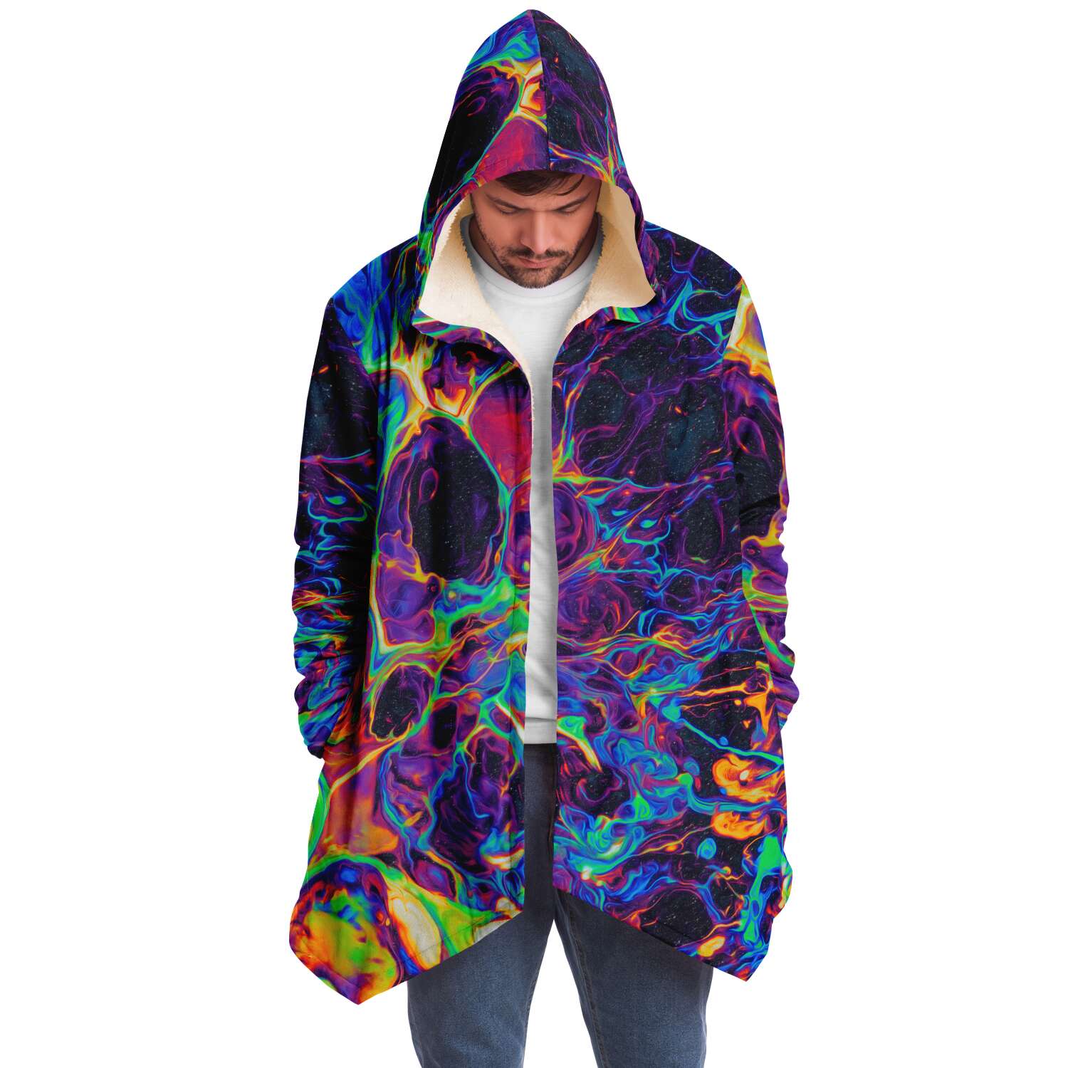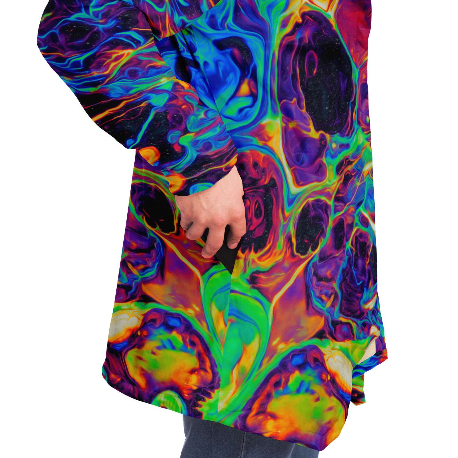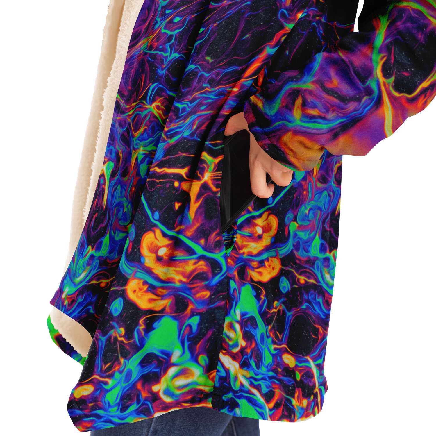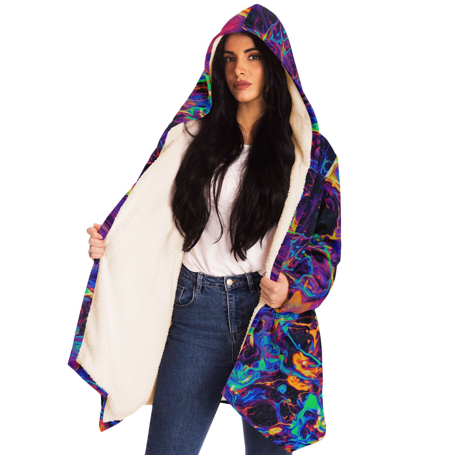 This luxurious cloak is made from an ultra-soft premium microfiber fleece lining. The outside is made with a micro-mink polyester fabric that allows the print to be high definition with vibrant colors. Featuring two deep side pockets to keep your belongings safe and your hands warm.