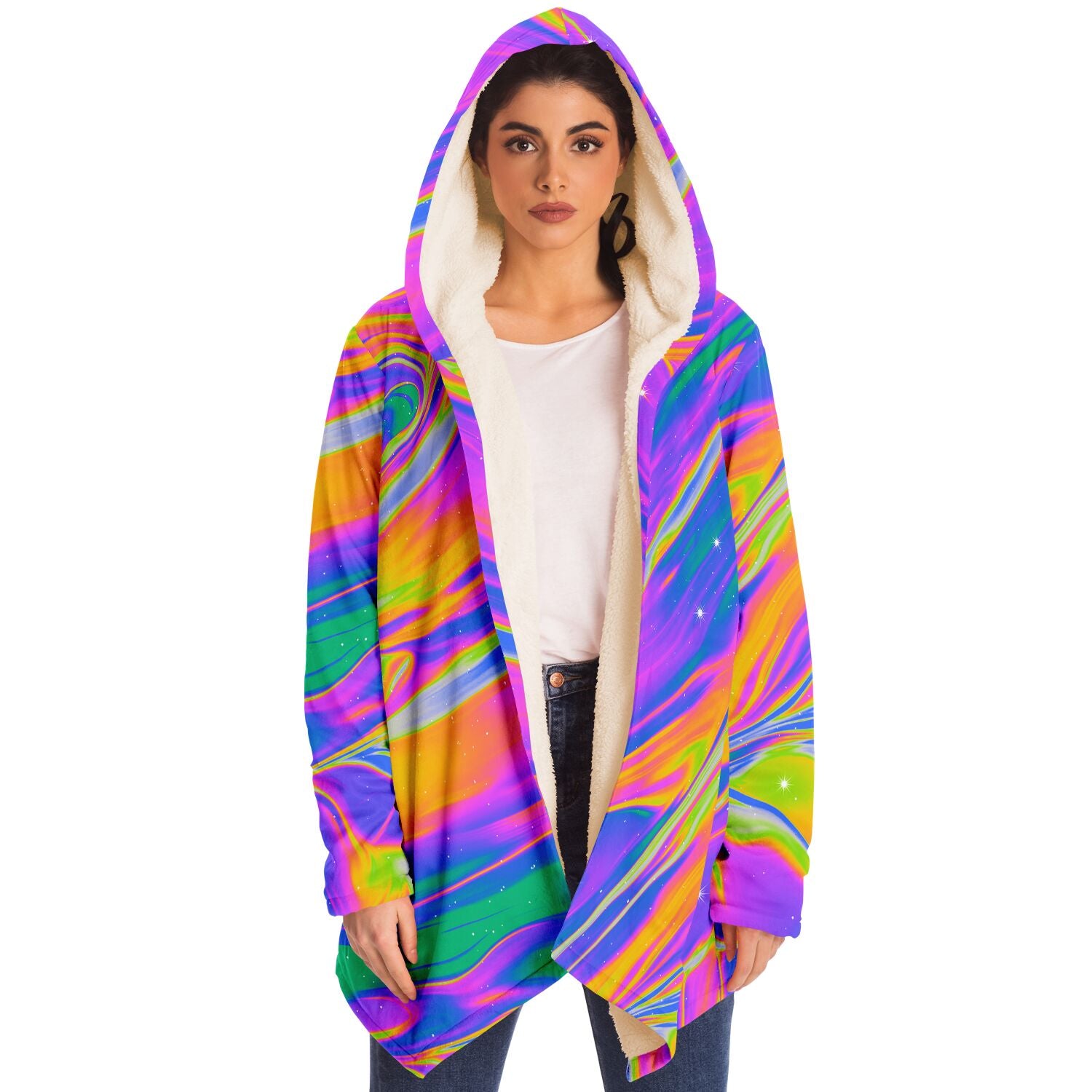 This luxurious cloak is made from an ultra-soft premium microfiber fleece lining. The outside is made with a micro-mink polyester fabric that allows the print to be high definition with vibrant colors. Featuring two deep side pockets to keep your belongings safe and your hands warm.
