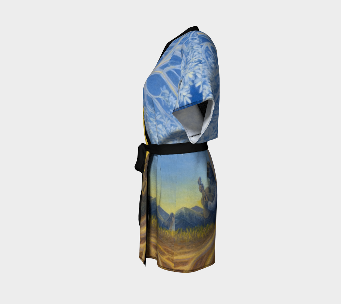 Artwork paired with luxury in this line of kimonos. Dramatic, elegant look. Perfect for special occasions, gallery shows and festivals!