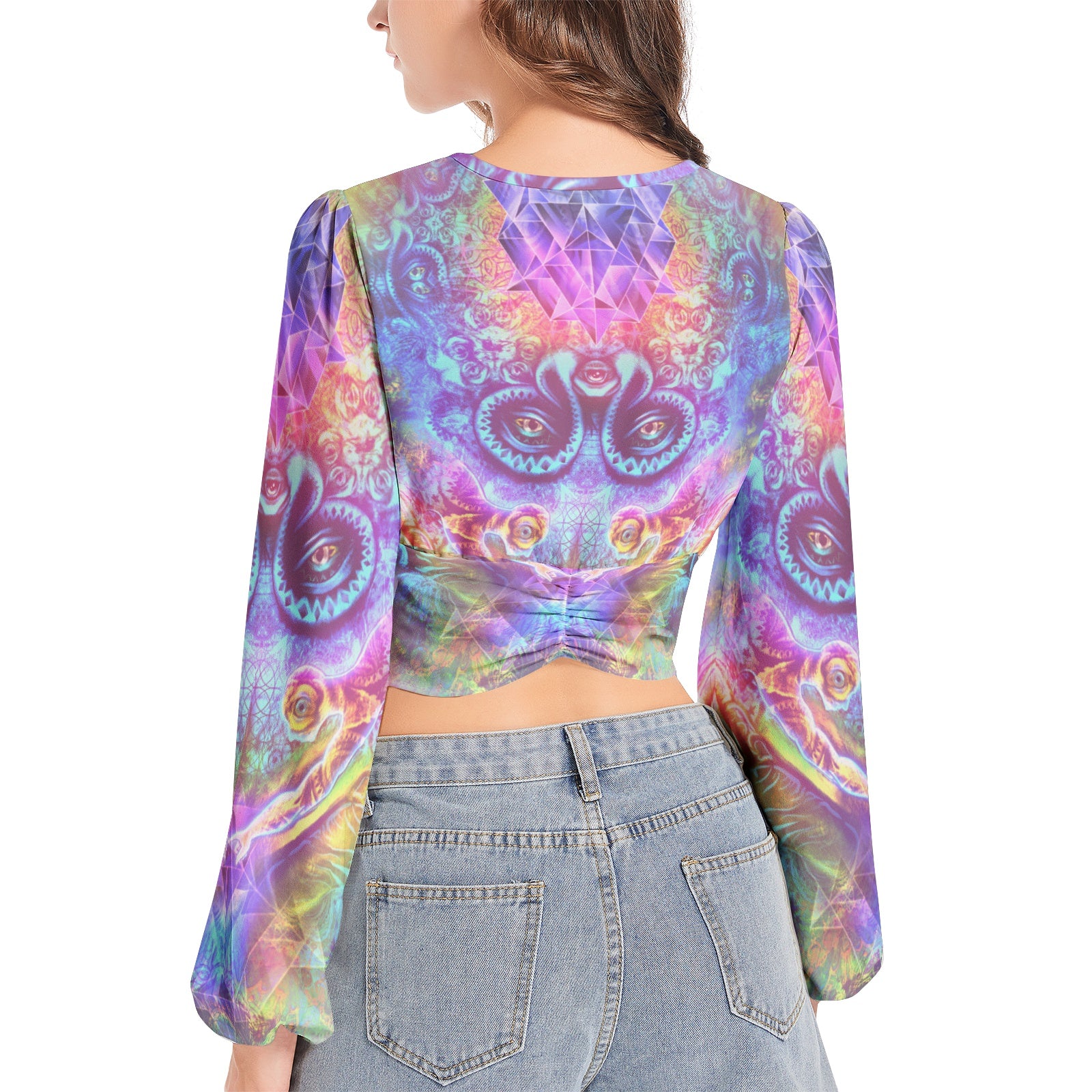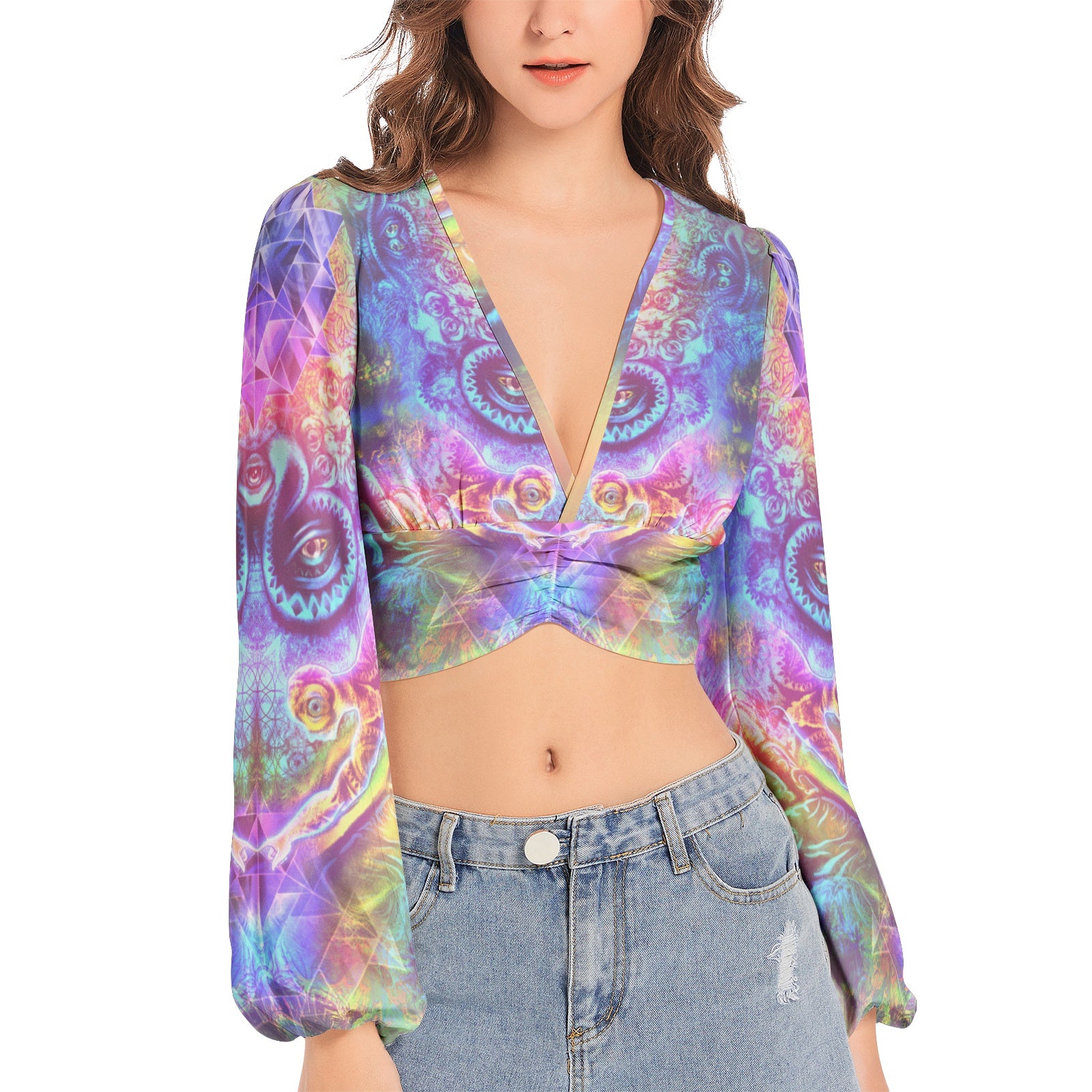 TRANSITION TO BUTTERFLY | Women's Deep V-Neck Lantern Sleeve Crop Top | SALVIA DROID