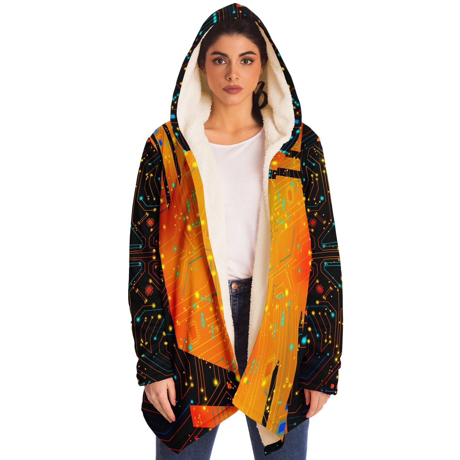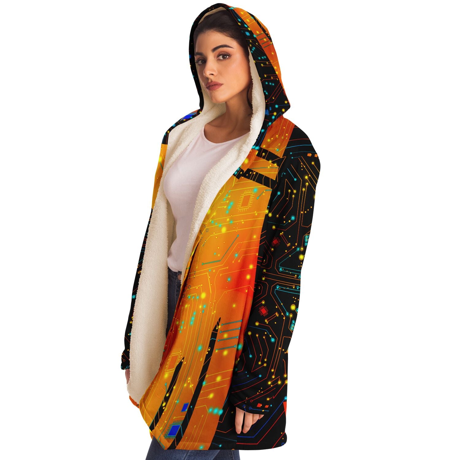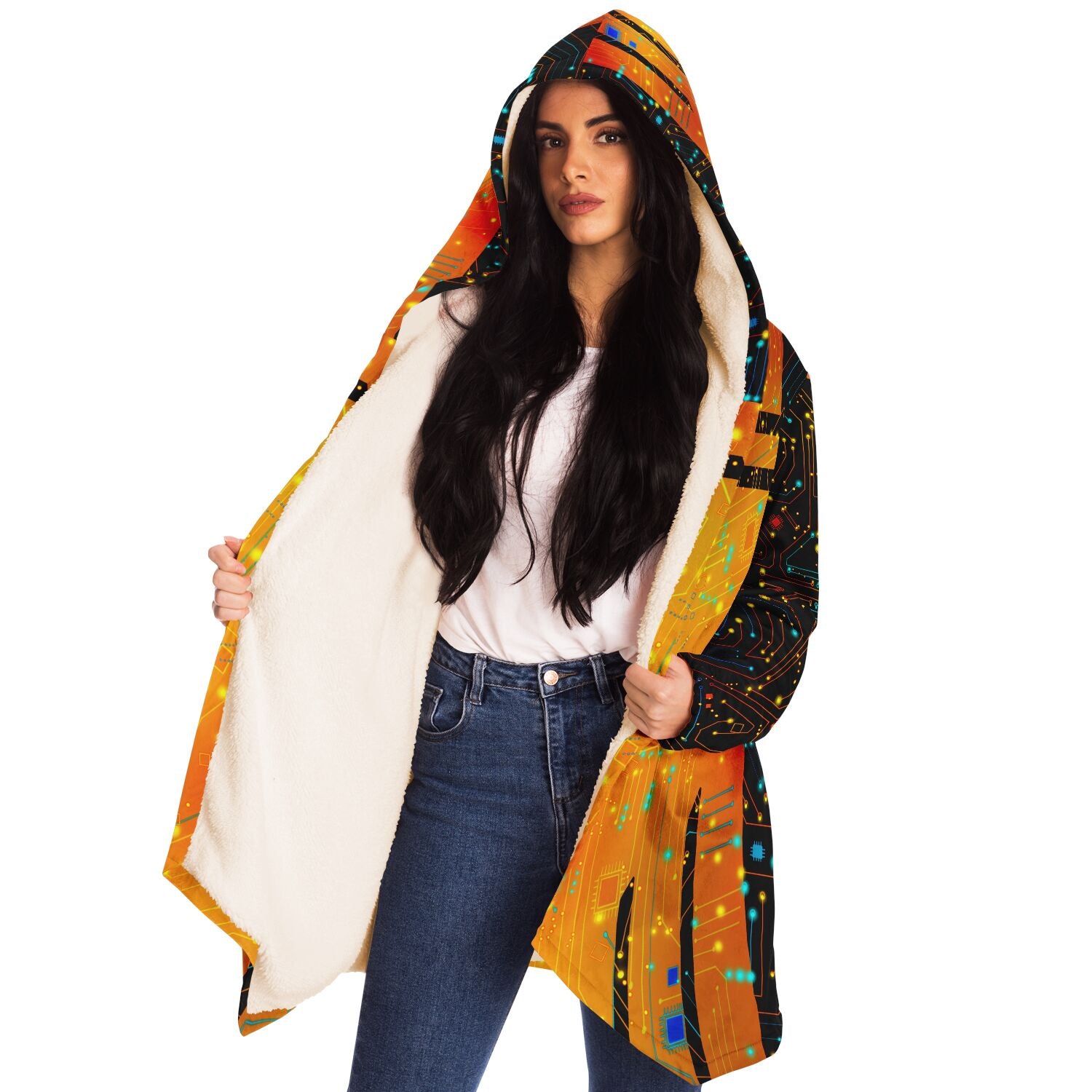 This luxurious cloak is made from an ultra-soft premium microfiber fleece lining. The outside is made with a micro-mink polyester fabric that allows the print to be high definition with vibrant colors. Featuring two deep side pockets to keep your belongings safe and your hands warm.