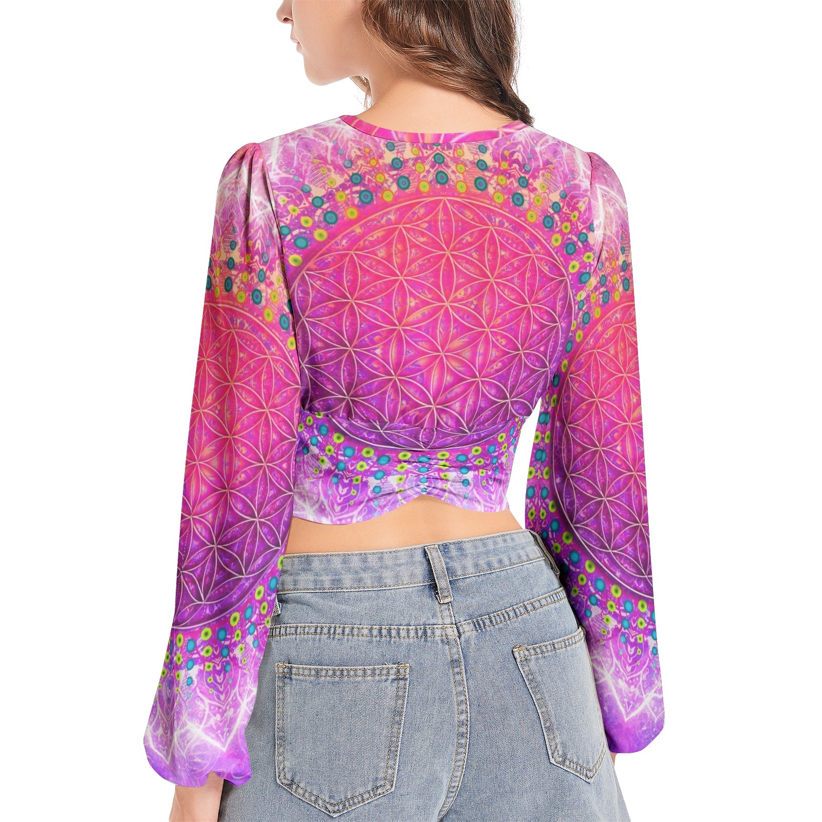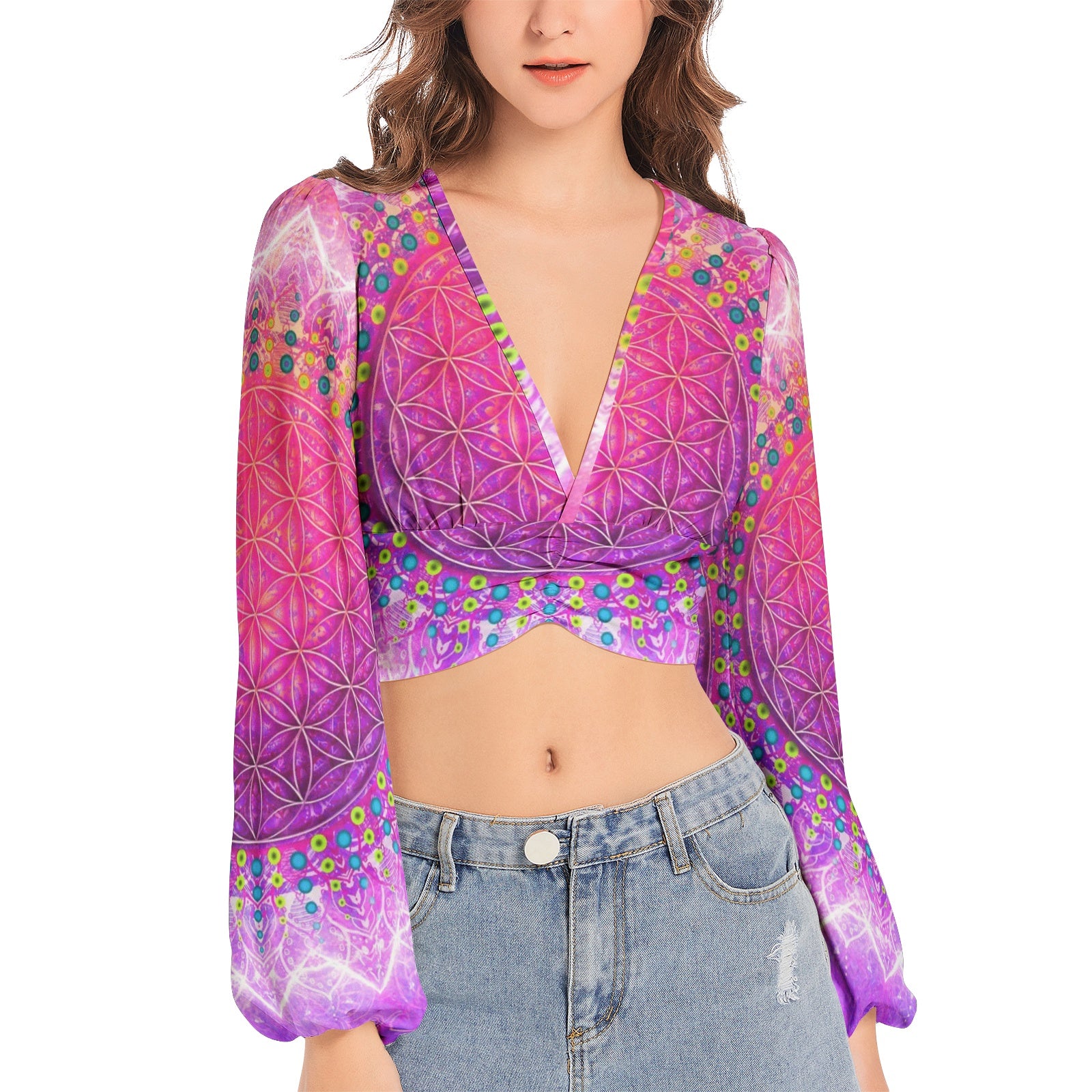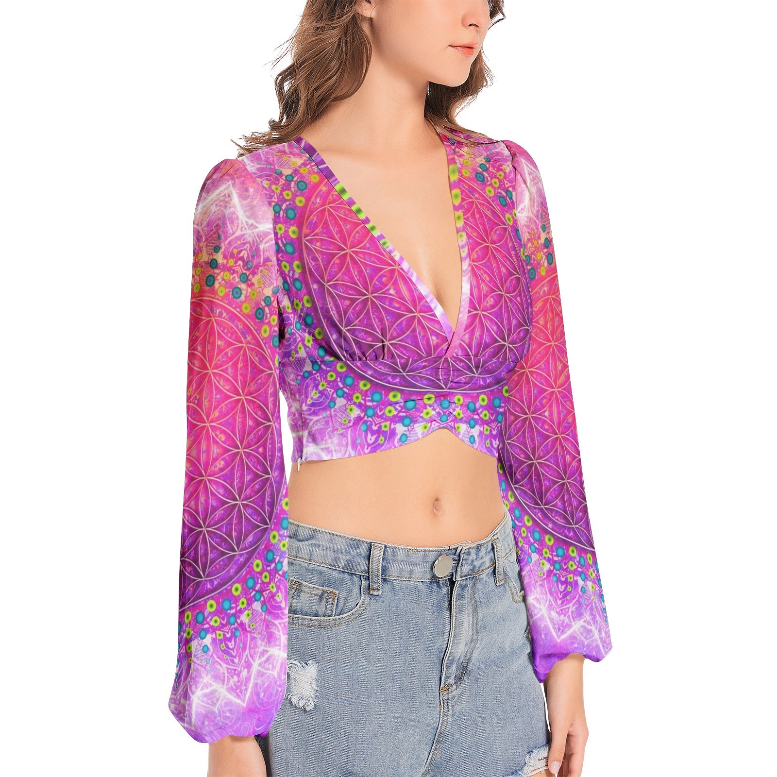 Cameron Gray | Flower of Life | Women's Deep V-Neck Lantern Sleeve Crop Top