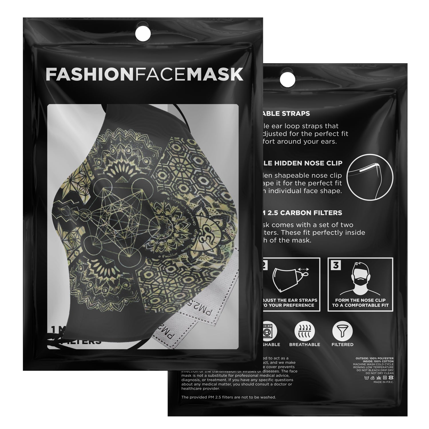 Look fashionable with this custom printed face mask. It comes with easily adjustable ear loop straps to fit all face shapes, as well as a shapeable hidden nose clip for that perfect fit. The outer surface is printed on a premium breathable polyester fabric that won't irritate your skin. While the inner surface is made from a soft breathable cotton fabric. On the inside of the face mask you can find a pouch where you can add any of your own filters. Each face mask also comes with 2 pieces of PM 2.5 filters that can be placed inside the pouch.
